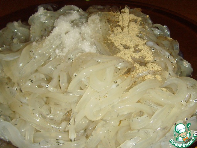 | Рыба-лапша бесцветная, почти прозрачная, мелкая рыба размером менее 10 см, с массой тела чуть больше 1 г. Дальняя родственница корюшке. Продаётся всего несколько дней два раза в год - весной и осенью. Рыба очень нежная, на вкус что-то среднее между корюшкой, кальмаром и креветкой. Как и у корюшки, у рыбы-лапши есть огуречный запах. Но не такой ярко выраженный, а лёгкий, еле уловимый. Что вместе с запахом свежей рыбы, создаёт неповторимый аромат. Необычайно вкусно! Всегда покупаю эту рыбу, если вдруг увижу её в продаже. |