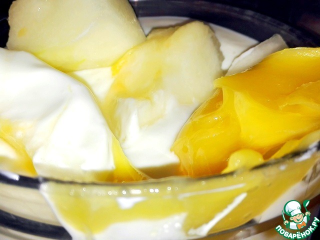 Дыня, банан, пюре папайи и маракуйи.