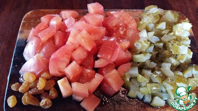 Помидор и соленые огурцы нарезать, изюм промыть. Помидор и изюм добавить к мясу. Установить программу "Тушение" 2 часа. Огурец добавить уже в практически готовое блюдо за 10 минут до выключения мультиварки.
