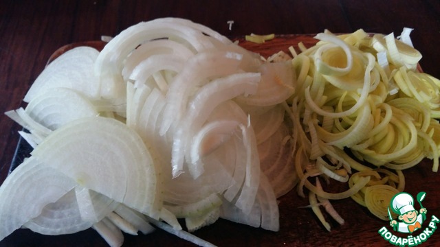 Репчатый лук и лук-порей нарезать тонкими полукольцами. Чеснок измельчить.