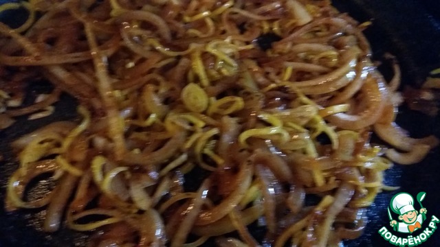 Обжарить лук на смеси сливочного и растительного масла. Подсолить и поперчить. В самом конце добавить рубленный чеснок и слегка обжарить до появления характерного запаха.