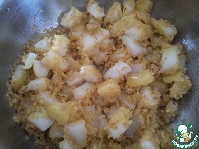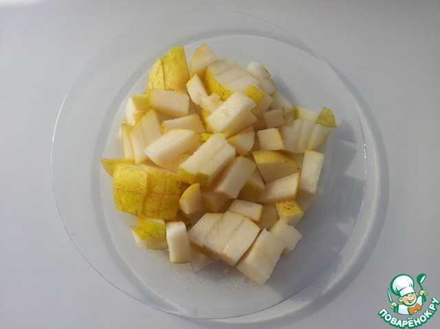 Грушу разрезать, удалить сердцевину, нарезать кубиками.