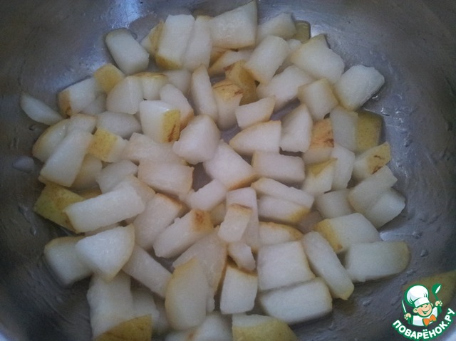 Растительное масло налить в небольшую кастрюлю, обжарить в нем грушу в течение 3 минут.