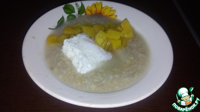 В остывшую кашу добавляем творог, сахар и нарезанный персик и мешаем. Вот и все, завтрак готов! Он очень вкусный, сытный и полезный. Персики можно заменить любыми фруктами и даже, наверное, сухофруктами. Я уже пробовала с мандарином, тоже очень вкусно. Приятного аппетита!