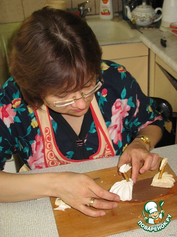 Кусочек хлеба или батона смазываем шоколадно-ореховой пастой. Это у нас пруд. Туловища лебедей делаем из белого и кремового зефира.