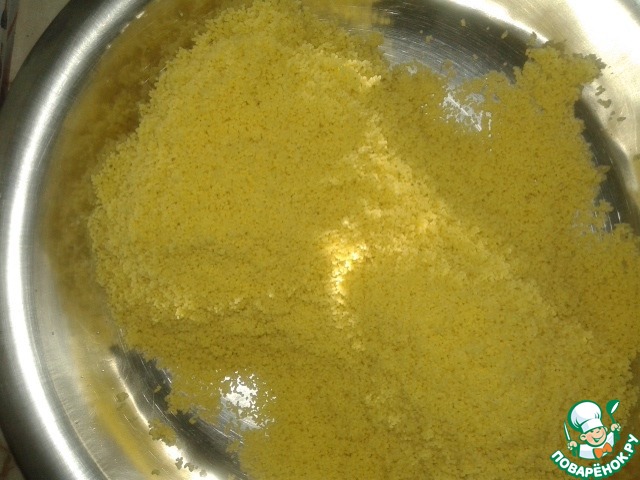 Прежде чем готовить подливу, арабы ее называют "марак" нужно поставить вариться кус кус... для этого высыпьте кус кус в не слишком глубокую посуду и возьмите столько же воды, сколько у вас кус куса... то есть если 1 стакан кус куса, один стакан воды... у меня одна маленькая чашечка... вливайте воду в кус кус порциями маленькими и разминайте руками, так, чтобы не было комочков..