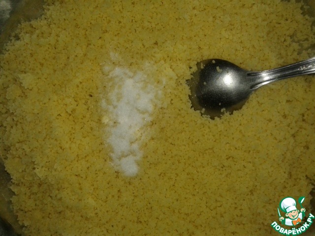 По истечении 20 мин кус кус вываливаем в ту же посуду где мы его перетирали, после того как кус кус немного остынет добавляем растительное масло примерно 1 ст. л, соль по вкусу и воды чуть больше пол стакана и снова перетираеи руками, чтобы не образовалось комочков и возвращаем его снова в посуду и варим еще 20 мин.