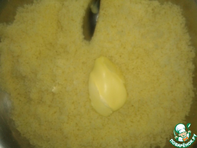 По прошествии 20 мин. кус кус снова вываливаем в посуду и проверяем, если он увеличился и стал мягким, он готов, а если же нет то так же отправляем вариться на 20 мин.. как только он приготовится добавить одну столовую ложку слив. масла и перемешатьпока горячий.. готово