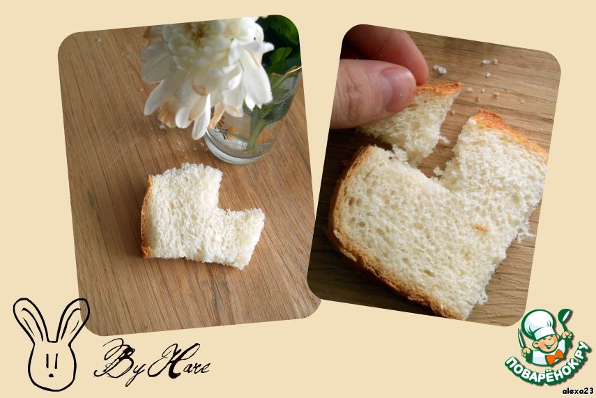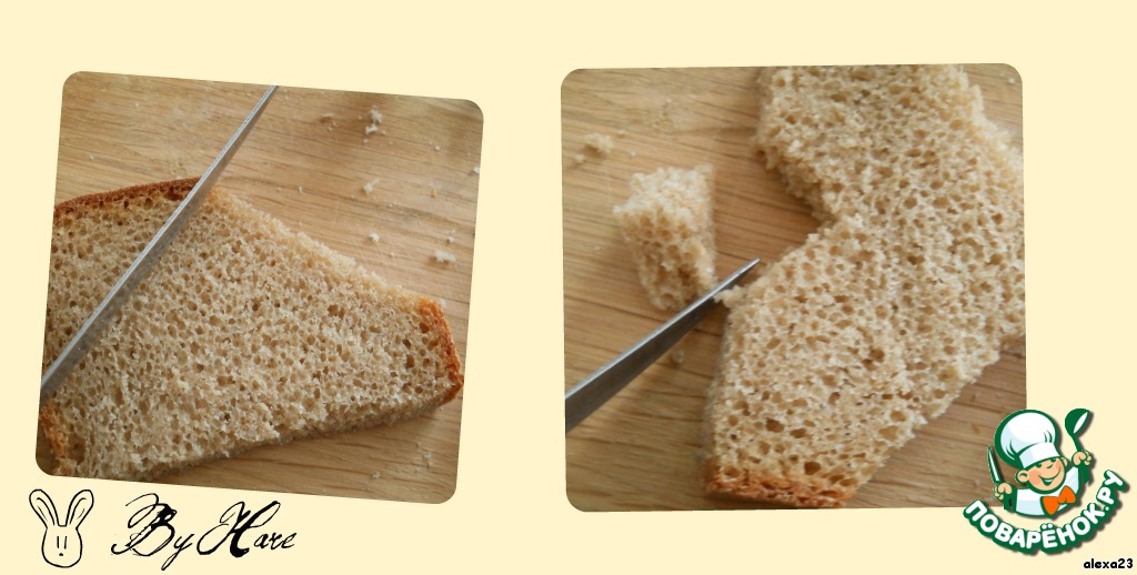 Пока на сковороде весело жарится колбаса, режем белый хлеб таким способом: ломоть режем пополам и в том месте, где он выпуклый, вырезаем маленький треугольник, чтобы получилось сердечко.