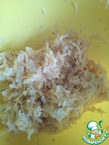Очищенный картофель натереть на терке и отжать жидкость. После того, как я удалили жидкость у меня получилось 500 грамм картошки.