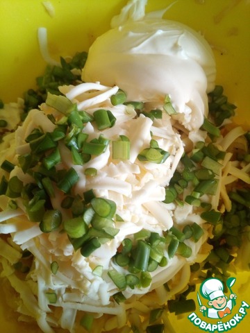 На крупной терке натереть сыр. Чеснок мелко порезать. Я чеснок заменила на чесночные стрелки. Добавить к натертой картошке сыр, чеснок, майонез, посолить и поперчить.