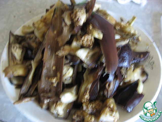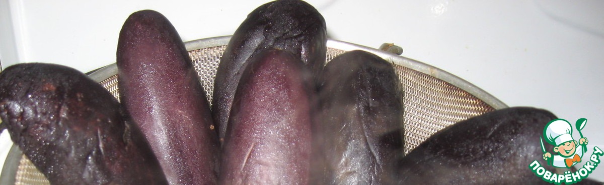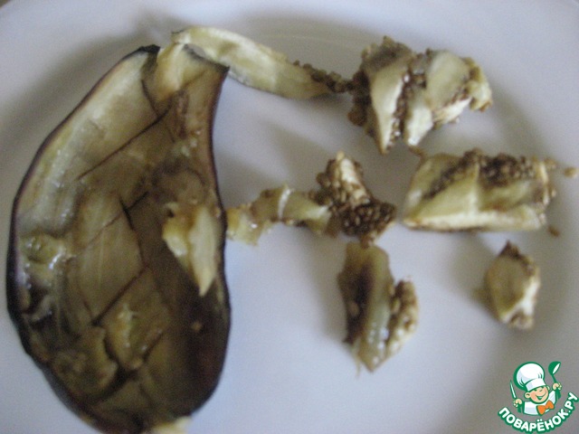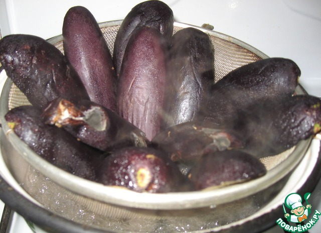 Через 25 минут вынуть баклажаны и мякоть освободить от кожуры. Баклажаны хорошо распарены.