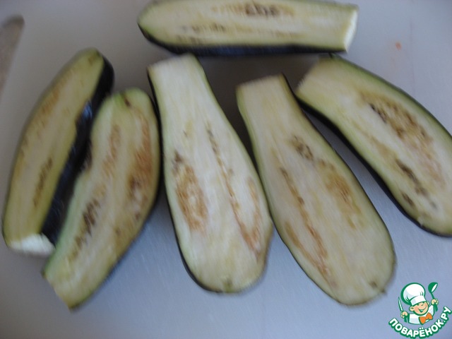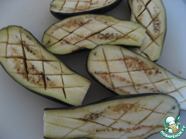 На каждой половинке баклажанов ножом сделать неглубокие надрезы крест на крест.