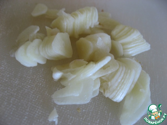 В сковороду с разогретым растительным маслом кладём чеснок и мелко нарезанные стебли базилика.