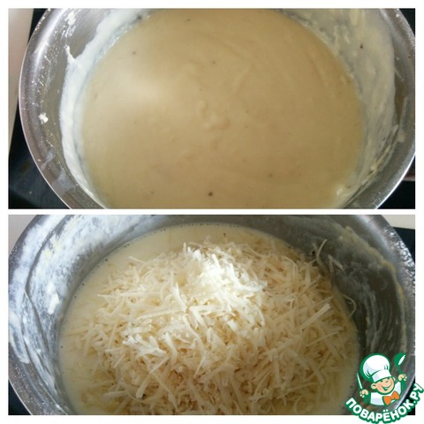 Добавляем сыр, хорошо перемешиваем, солим, перчим. Соус получается очень ароматный нежный и густой.
