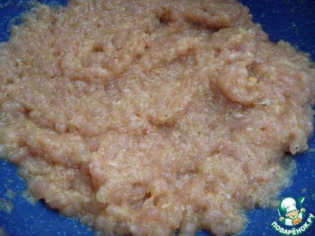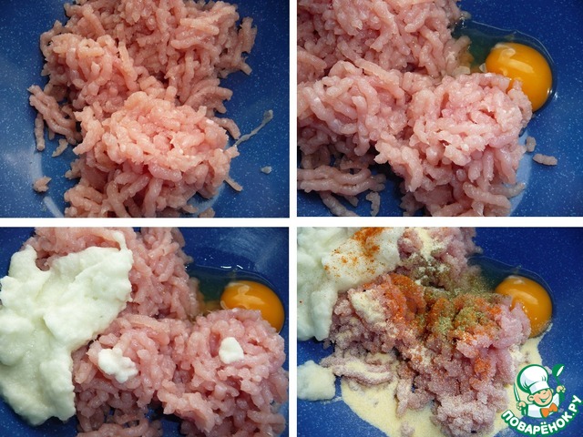 Приготовить фарш, мясо перекрутить на мясорубке, добавить яйцо, лук (я взбиваю в блендере), соль, перец, специи, манную крупу.