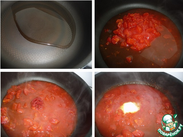 В сковороду влить воду, закипятить, добавить томаты в собственном соку, томатную пасту, соль, сахар (чтобы нейтрализовать кислоту), сливочное масло, перец.