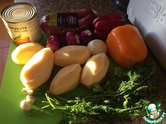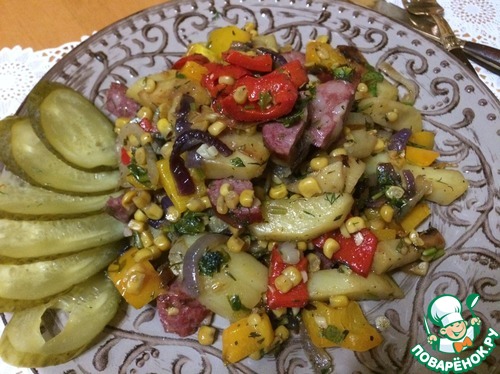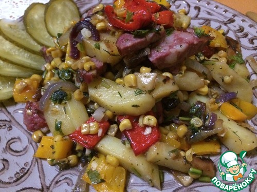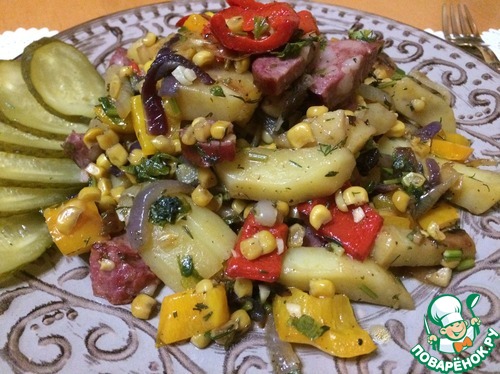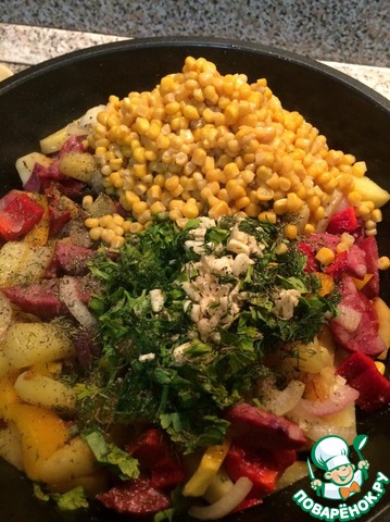 Добавляем перец, всё перемешиваем и жарим 7-8 минут, чтобы все продукты подружились. Когда картофель практически готов, добавить кукурузу, чеснок, петрушку, посолить, поперчить.