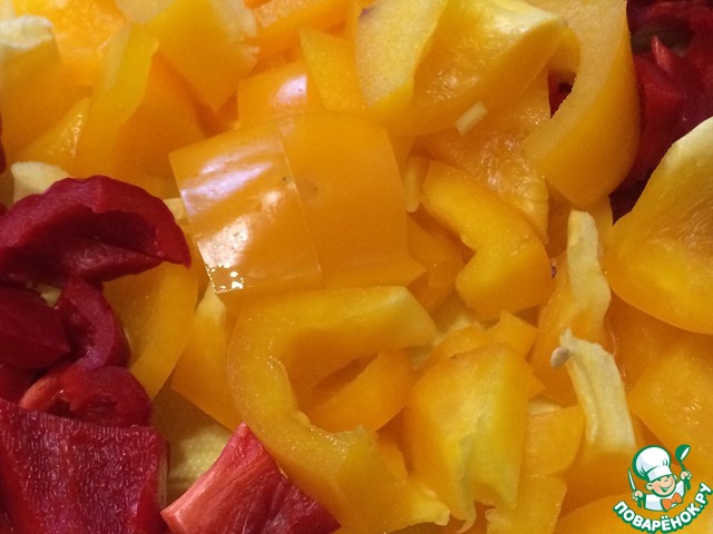 Перец на четвертинки разделить и брусочками настрогать. Кукурузу откинуть на дуршлаг.