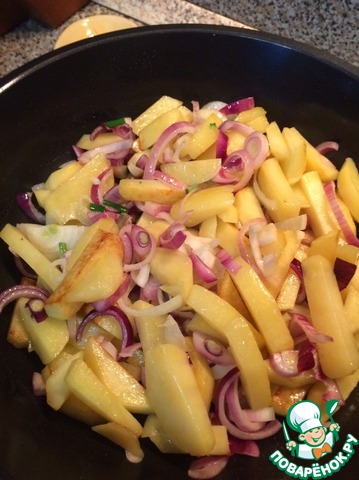 Добавить к картофелю лук, обжарить в течении 1,5 минут на сильном огне.