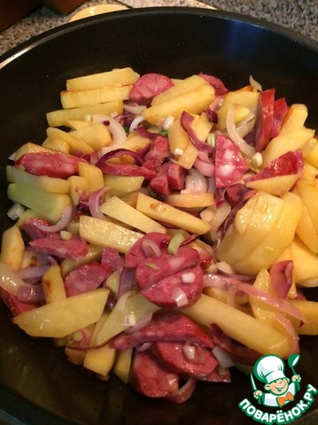Картофель порезать соломкой, колбасу не очень крупными кусочками.