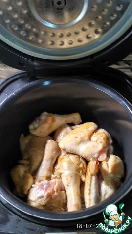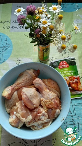 Первым делом подготовим куриное мясо. У меня было 4 окорочка, которые я разделила на бедро и голень. Моем, обсушиваем и натираем солью со специями. Укладываем в миску, накрываем крышкой и отправляем мариноваться. Лучше, если это будет на всю ночь, чтобы курица получилась мягкой и ароматной.