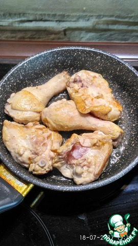 Через время достаем курицу и начинаем обжаривать с двух сторон до золотистого цвета, 3-5 мин с каждой стороны.
