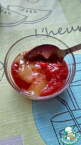 Тем временем делаем медовый соус. Для это в пиалке смешиваем мед с кетчупом. Кетчуп должен быть хорошего качества, а мед желательно жидкий, но не обязательно, он хорошо растворяется. Соуса можно сделать побольше, но в соотношение 2:1 кетчупа к меду соответственно.