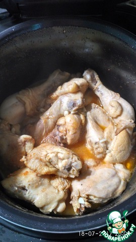 Добавляем наш соус к курице, она должна хорошо пропитаться им. Тушим на медленном огне до готовности, а в конце увеличиваем огонь и с открытой крышкой выпариванием лишнюю влагу, можно даже обжарить. Но можно оставить и в виде соуса. Так тоже вкусно.