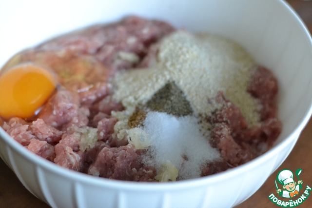 В миске смешаем фарш с яйцом, сухарями, чесноком, петрушкой, тмином, солью и перцем.