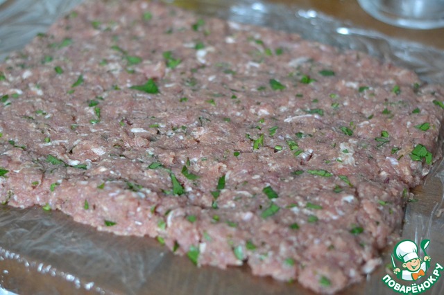 Выкладываем на нее фарш и формируем прямоугольник.