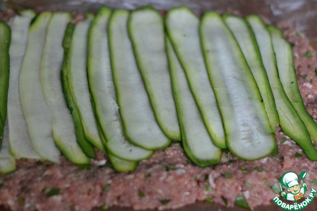 Выкладываем полоски цуккини на фарш. В один слой, слегка внахлест.