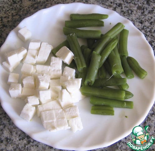 Стручковую фасоль помыть, почистить и нарезать. Отварить ее в подсоленной воде в течение 10 минут. Свежий сыр нарезать кубиками.