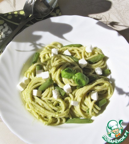| Классический соус песто имеет три неизменных ингредиента – кедровые орешки, базилик и пармезан. Мы сегодня приготовим соус песто с использованием грецких орехов, немного нетрадиционный, но очень вкусный! В этом рецепте можно использовать спагетти из цельнозерновой муки, тогда блюдо получится совершенно диетичным. Этот рецепт также становится более облегченным за счет замены пармезана наполовину на свежий сыр, а также добавления стручковой фасоли. |