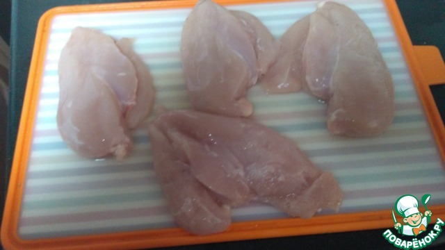 Куриную грудку, если она крупная режем поперек, и слегка отбиваем. У нас куриное филе мелкие, нежные, поэтому я их оставила как есть.