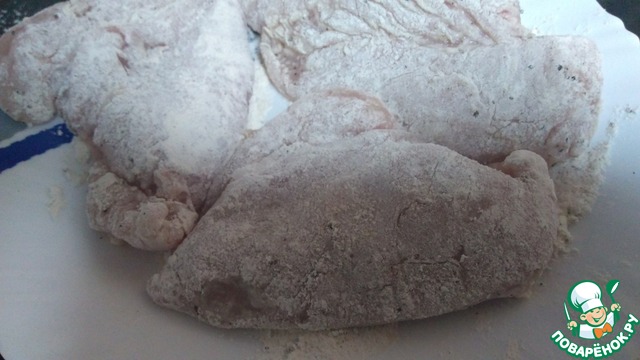 Обваливаем филе в этой муке, стряхивая излишек муки.
