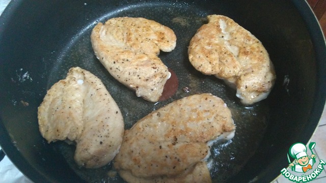 На горячей сковородке нагреваем растительное масло, обжариваем в нем куриное филе с двух сторон до золотистой корочки (примерно по 5 минут с каждой стороны)