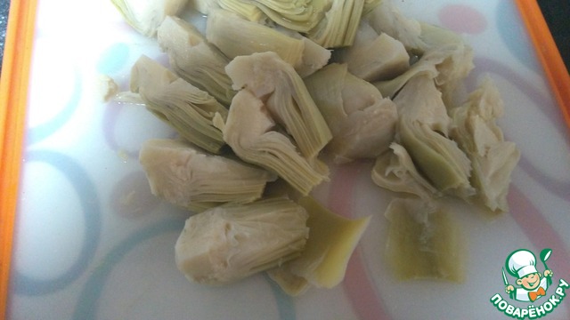 Пока курица обжаривается, достаем из банки артишоки, режем их на четвертинки,