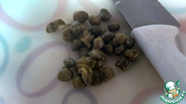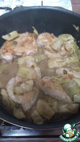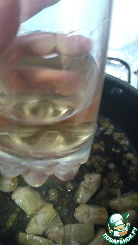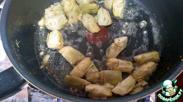 Выкладываем туда же порезанные артишоки, чеснок, каперсы, и обжариваем пару минут до мягкости чеснока.
