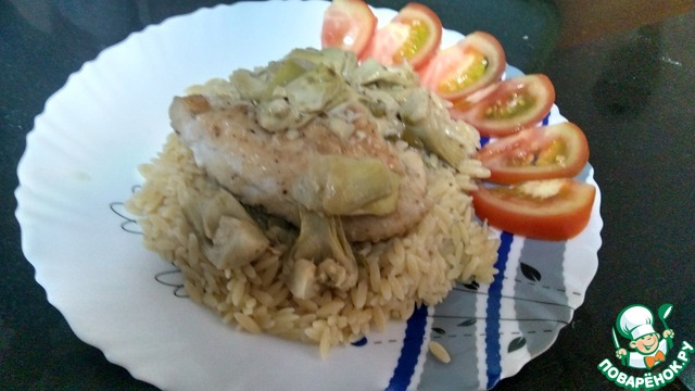 В готовую пасту добавляем чуть-чуть сливочного масла (по желанию), и сервируем с нашей курицей, которую поливаем сверху соусом с артишоками.
