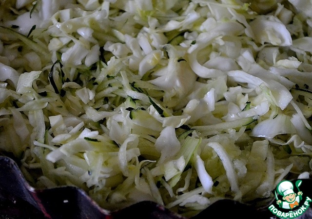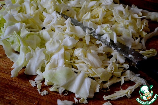 Шинкуем молоденькую капусту и лук. Перетираем руками для сочности