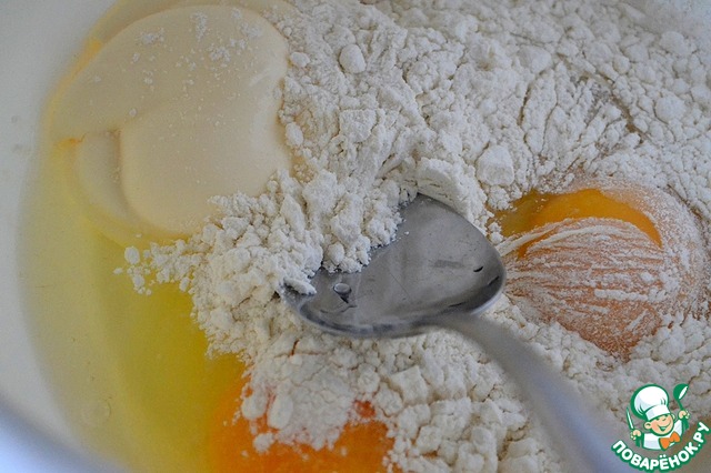Перемешиваем ложкой сметану, яйца и муку. Солим по вкусу.