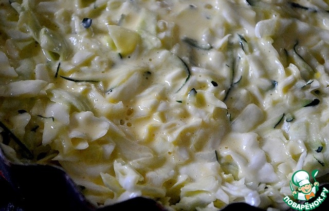 Выкладываем заливку на овощи и распределяем по всей поверхности.