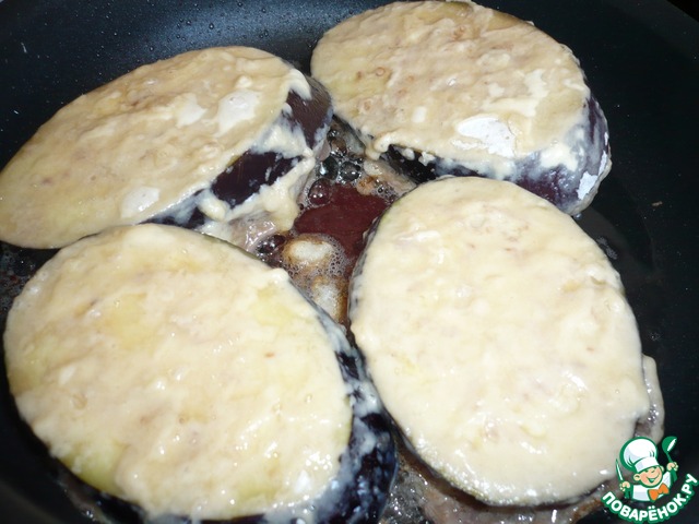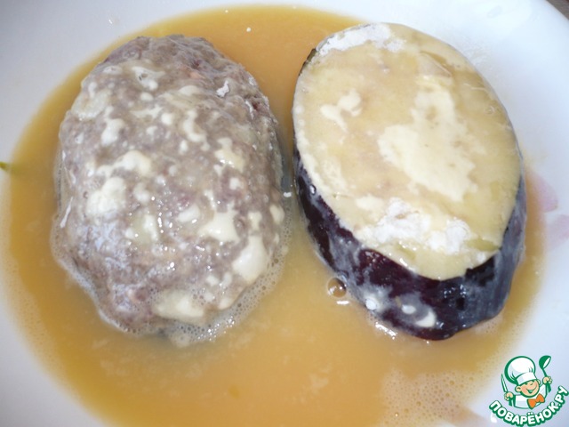 Остальные 2 яйца вбейте в отдельную миску и разболтайте вилкой, смешивая желток с белком и обмакните обваленные в муке баклажаны с фаршем в яйце.