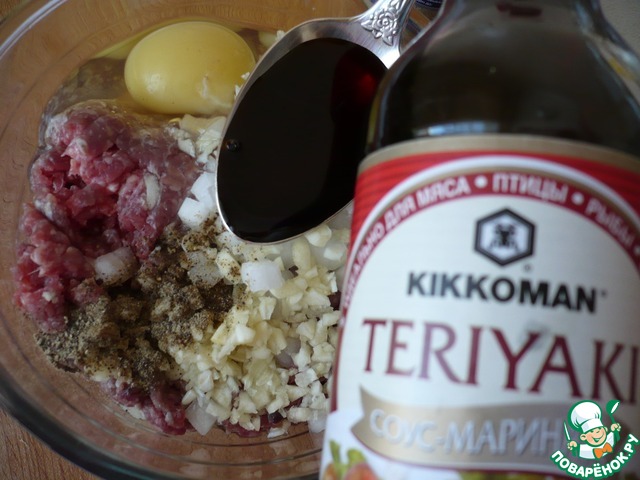 В мясной фарш добавляем измельченный лук и чеснок, яйцо, соевый соус Teriyaki ТМ "Kikkoman", (при необходимости солим), перчим по вкусу и добавляем специи. Фарш хорошо перемешать.