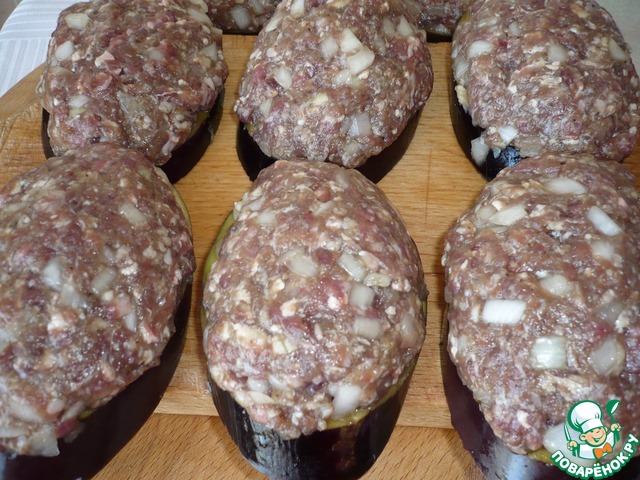 На каждую дольку баклажана выкладываем мясной фарш, прижимаем и формируем лепешку.