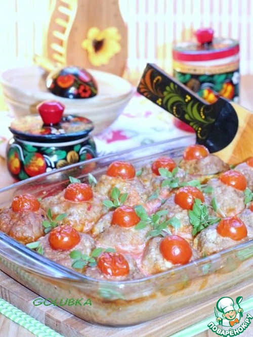 8. Макаем фрикадельки в белок, обваливаем в муке и выкладываем на кабачки. На фрикадельки кладем половинки помидорчика черри. Небольшим нажатием, "утопим" помидорчики.