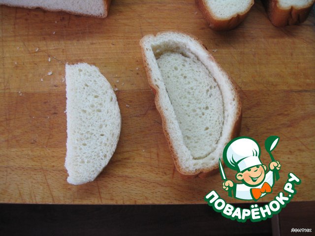 Вырезанное дно разрезаем вдоль пополам и формируем лодочкой будущий бутерброд.