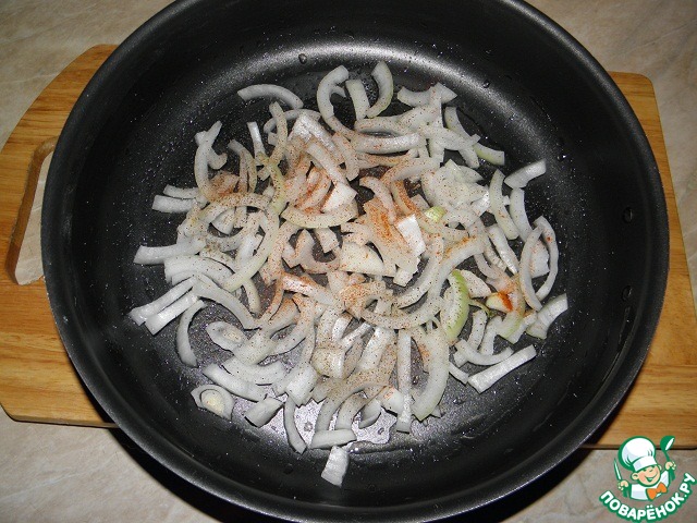 Наверх выкладываем вторую половину лука, посыпаем специями