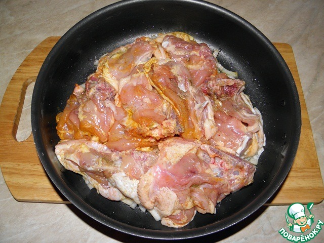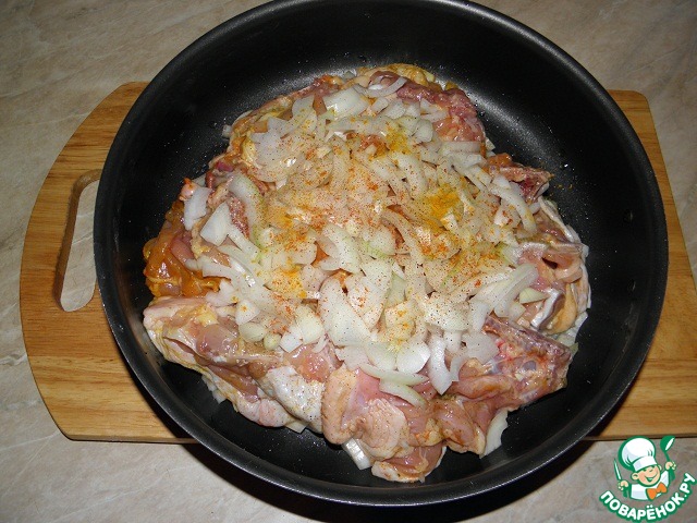 На лук укладываем плотно друг к другу куриные части (я заранее посыпала их специями) верхней-лицевой частью вниз. Друзья, хочу предупредить, куски курицы, если части крупные надо разрезать, чтоб все пропеклось хорошо.